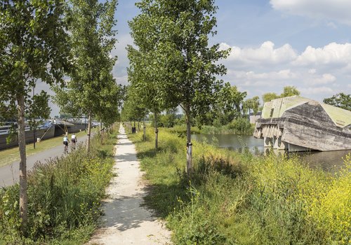 Het profiel van de nieuwe liniedijk heeft een eenvoudige en robuuste vormgeving die wordt aangezet met een dubbele rij populieren. Het profiel is duidelijk anders vormgegeven dan de oude liniedijk, om verwarring en geschiedsvervalsing te voorkomen. Dit heldere profiel zetten we door langs het gehele Lekkanaal.
