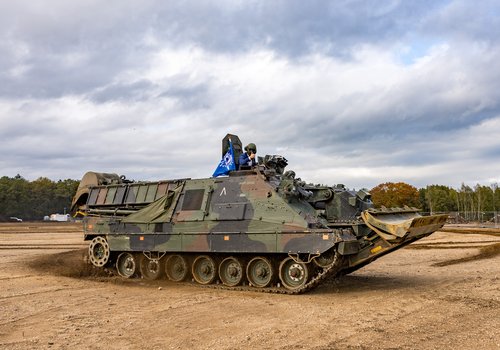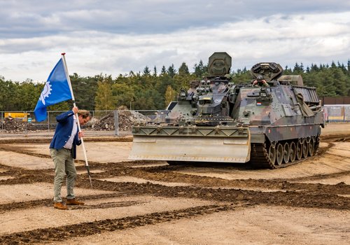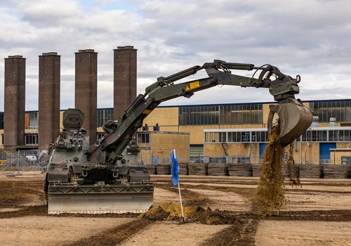 De bouw van het Technologie Centrum Land is gestart! Maandag 20 oktober was een bijzonder moment: de staatssecretaris van Defensie - Gijs Tuinman - gaf het startsein met een Kodiak (een Leopard 2-geniedoorbraaksysteem) voor de spectaculaire eerste schop in de grond. Gezamenlijk hebben we het glas geheven op een voorspoedige bouw van het Technologie Centrum Land in Leusden dat in 2028 gereed zal zijn.